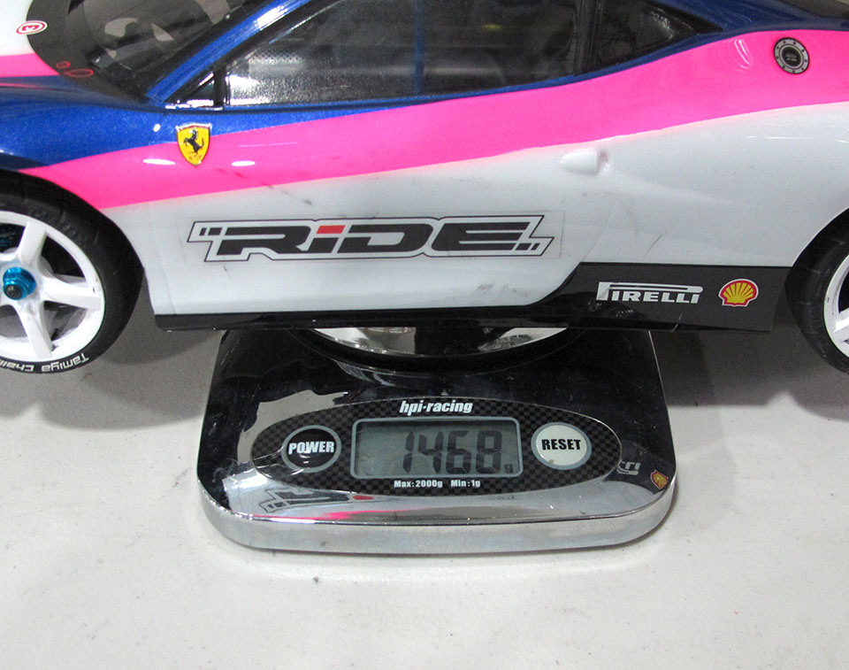シャーシ左側のセンターバルクやミッションシャフトが軽くなったので、シャーシ右に積んでいたウェイトを半分に減らし、タイヤ、バッテリー、ボディー を付けた状態で体重測定。