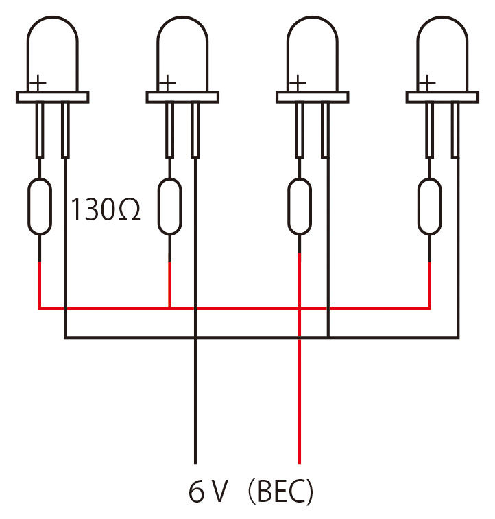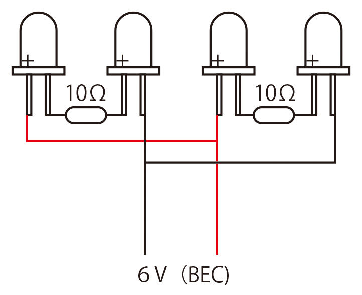 そこで、受信機のBECから電源を取れるように、LED回路を作ってみることにします。