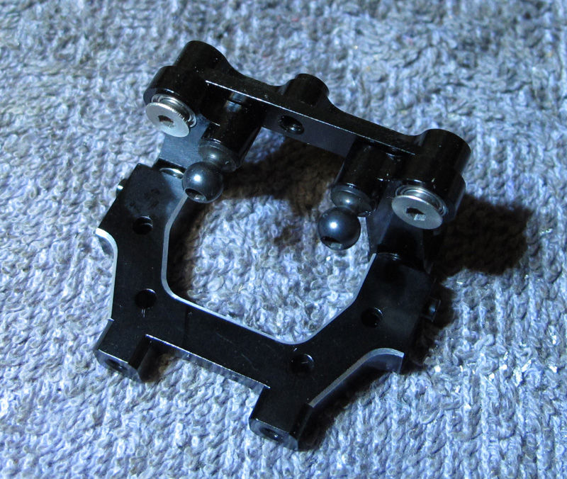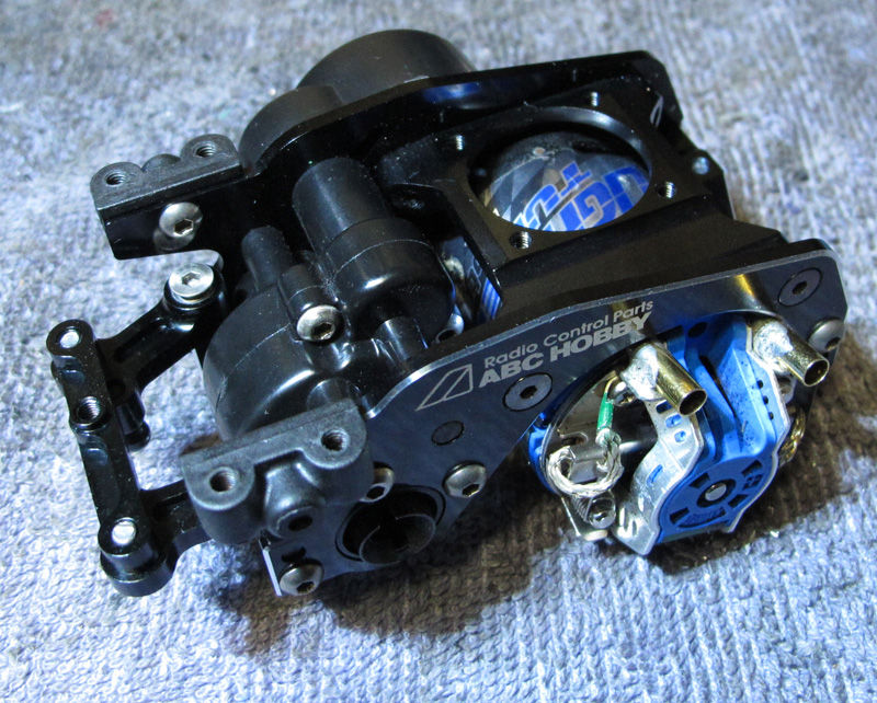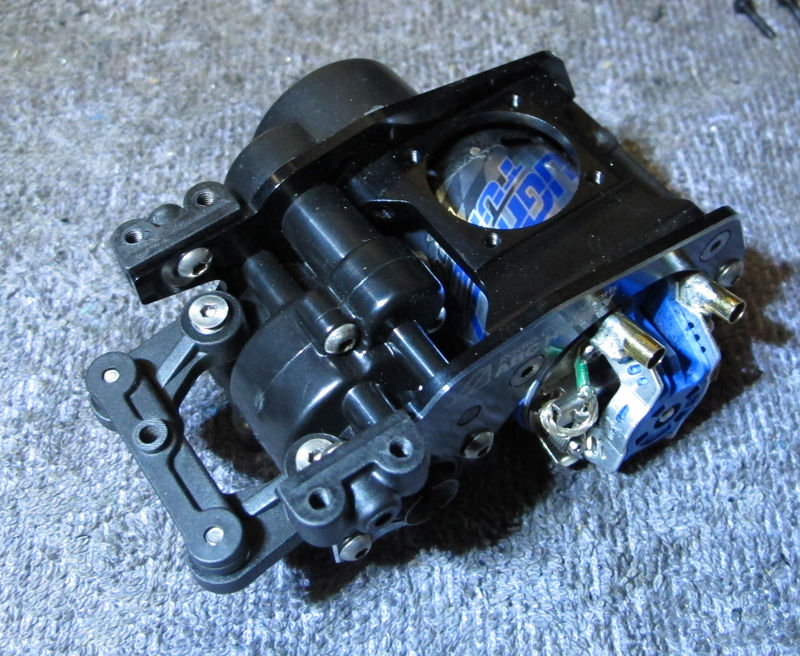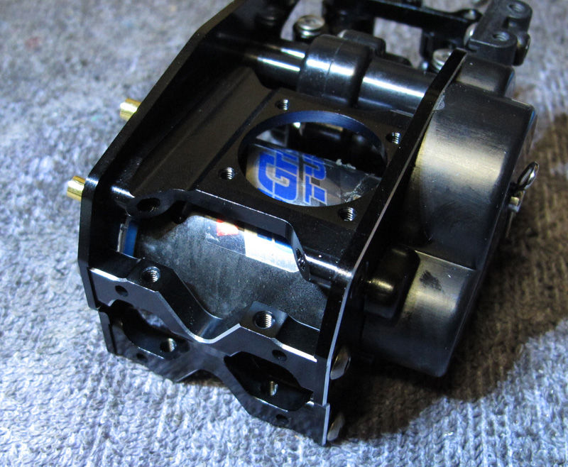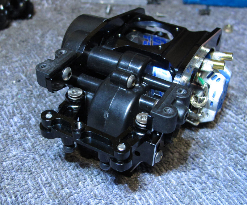 ギヤボックスユニットについている、プラスチック製のステアリング周りとモータープレートホルダーを、 アルミオプションと交換。