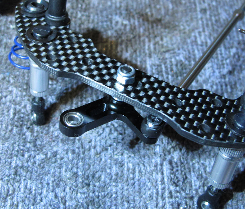 『CFRPフロントアッパーマウント』にステアリングクランクを取り付け。